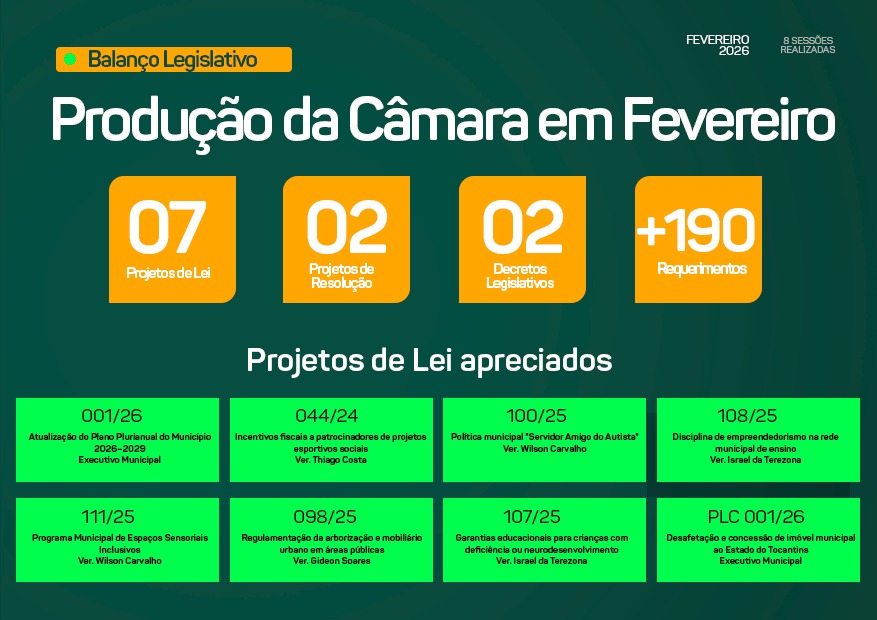 Durante o mês de fevereiro de 2026, o Poder Legislativo Municipal de Araguaína desenvolveu ampla atividade parlamentar,…